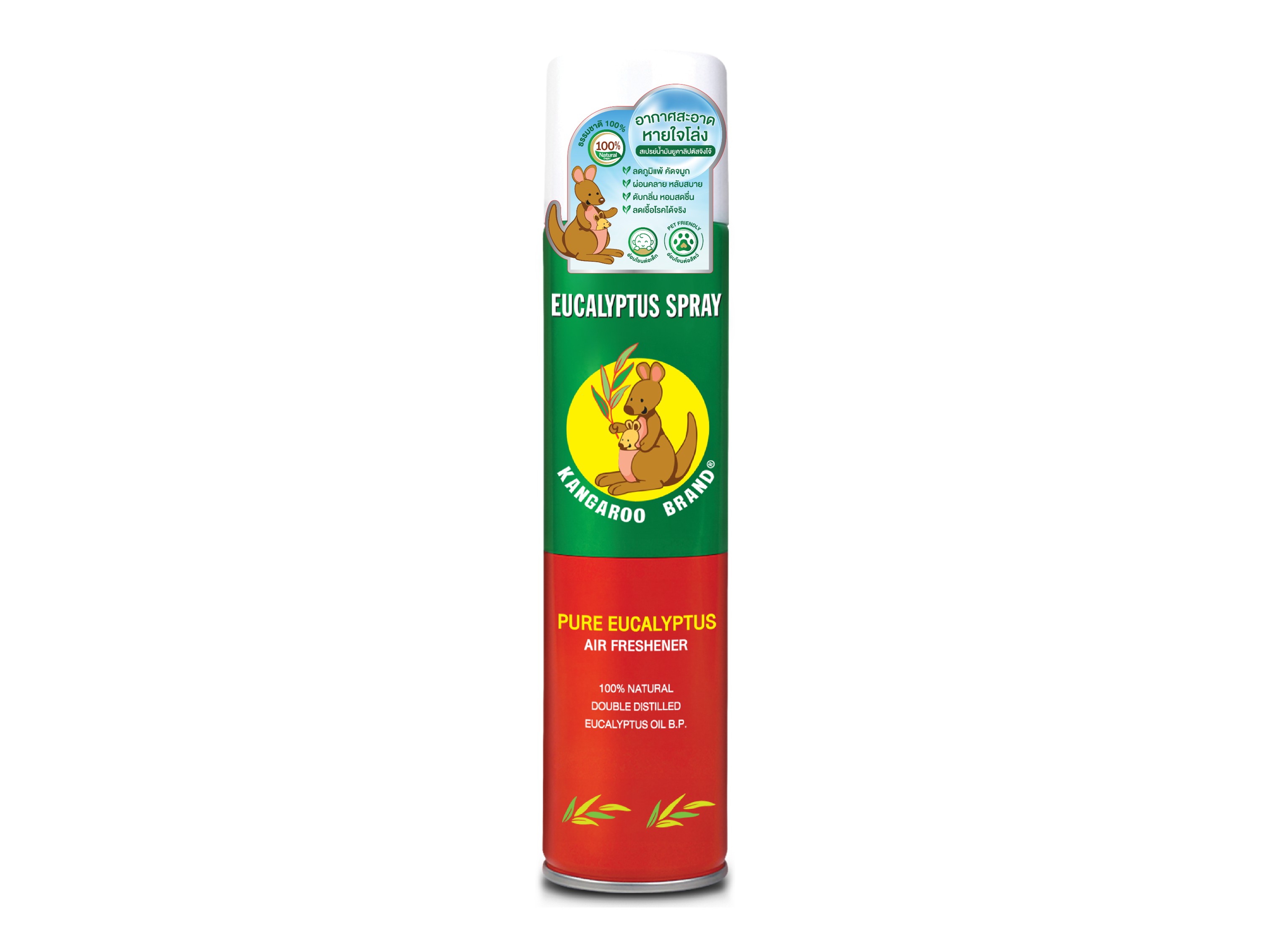 น้ำมันยูคาลิปตัส สเปรย์ ตราจิงโจ้ ผลิตจากน้ำมันยูคาลิปตัสจากธรรมชาติ 100% ไม่มีน้ำหอม หรือสารอื่นเจือปน ปรับอากาศให้หอมสดชื่น ช่วยบรรเทาอาการหวัด คัดจมูก ปลอดภัย อ่อนโยนต่อเด็ก ลดอาการเป็นภูมิแพ้